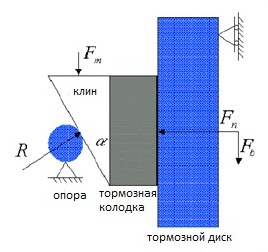 Тормозная сила Fb, образующаяся из контакта между тормозным диском и тормозной колодкой, действует в том же направлении, что и сила тормозного привода Fm, что и приводит к ожидаемому самоусилению (рис. 2). За счёт этого тормозная система требует минимум энергии извне.