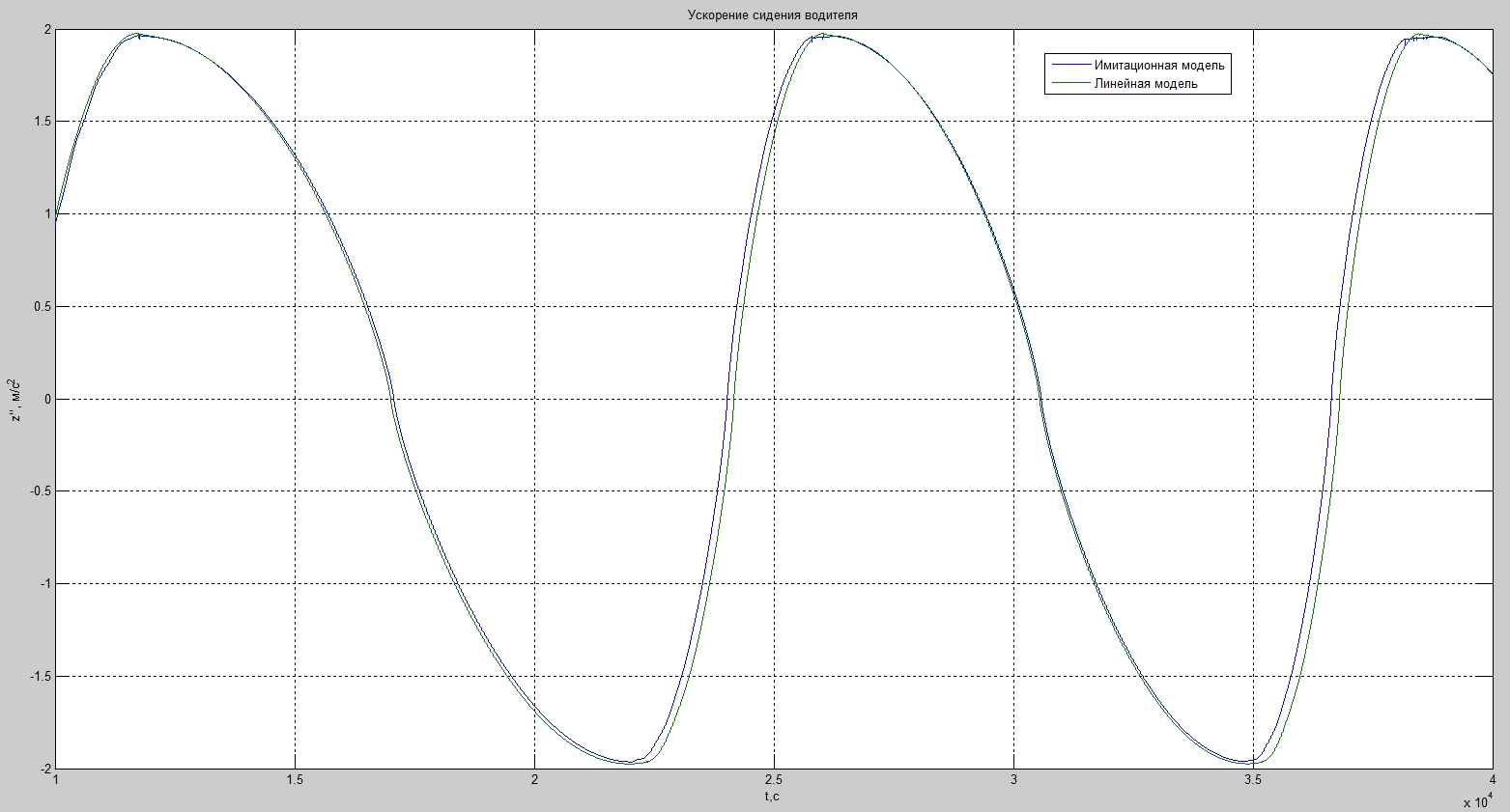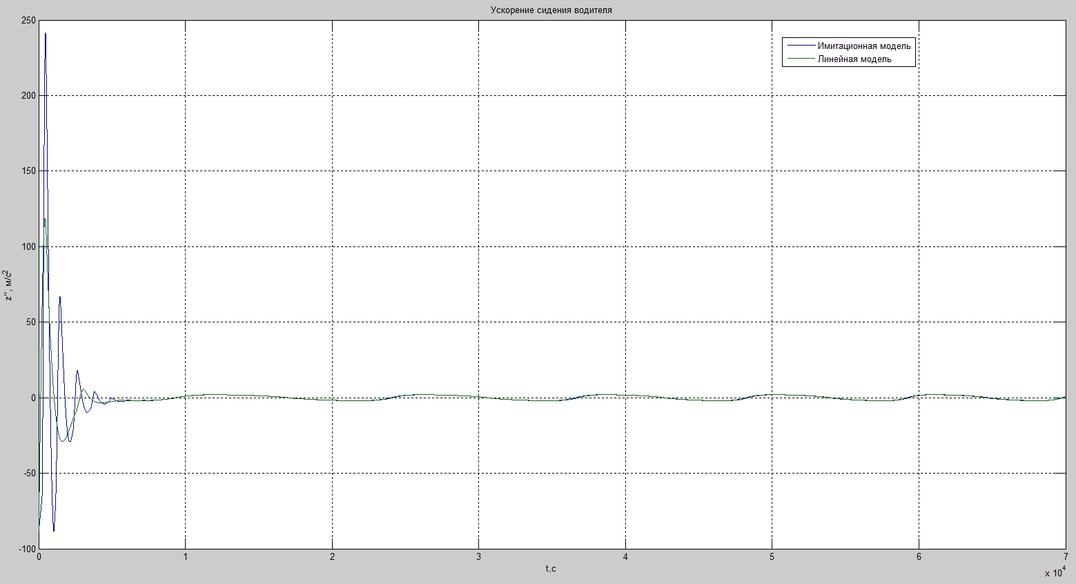 На представленных рисунках наложены два графика, полученные при постоянном коэффициенте жёсткости и с помощью имитационной модели. Как видно получившиеся зависимости ускорения от времени несколько различаются.