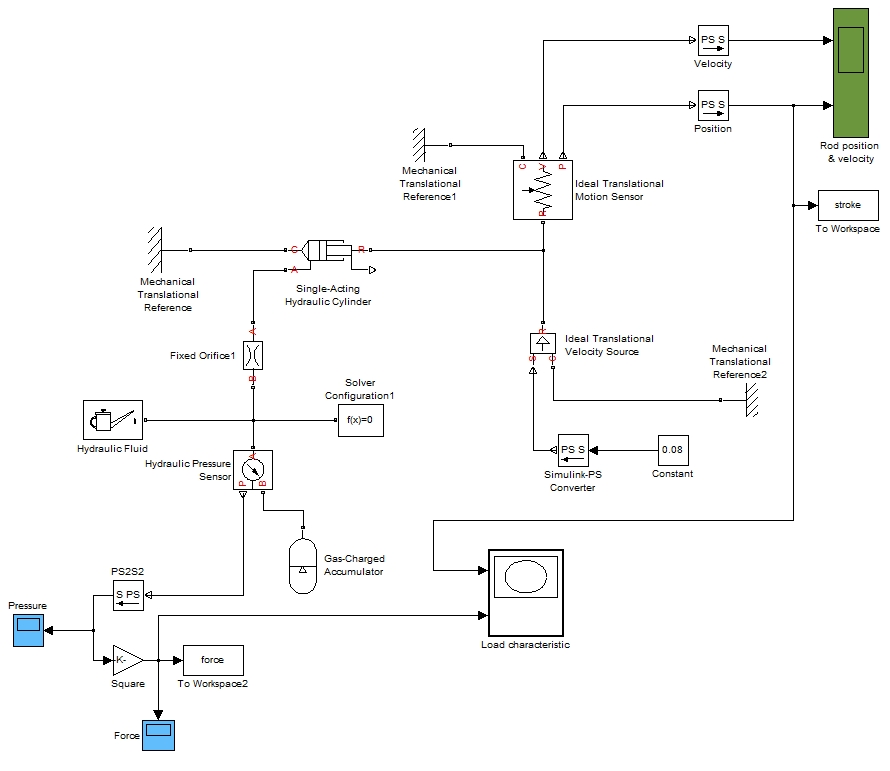 На вход модели подается сигнал, характеризующий скорость перемещения поршня в основном цилиндре. Скорость принимаем постоянной и равной 0,08 м/с. Скорость достаточно мала, чтобы по возможности максимально уменьшить искажение нагрузочной характеристики упругого элемента из-за наличия потерь на демпфирование.