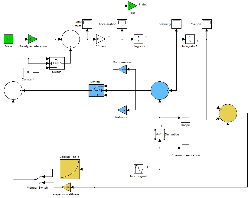 На ходе отбоя и сжатия подвеска имеет разные коэффициенты демпфирования, поэтому используем блок “Switch”, позволяющий изменять нужное значение в зависимости от заданного условия.