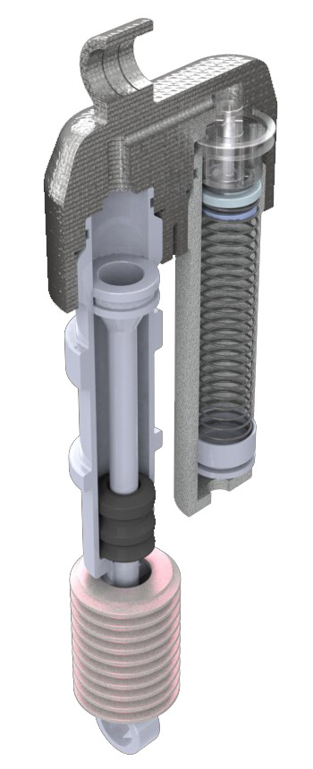 Ниже представлена модель пневмогидравлического элемента, состоящего из цилиндра, в котором установлены поршень и шток, дополнительного цилиндра с плавающим поршнем, образующие гидравлическую и пневматическую полости гидроаккумулятора ПГР. Цилиндры установлены в корпусе, в котором имеется канал, соединяющий их через клапан, выполненный в виде саморегулируемого по частоте и амплитуде колебаний демпфирующего узла.