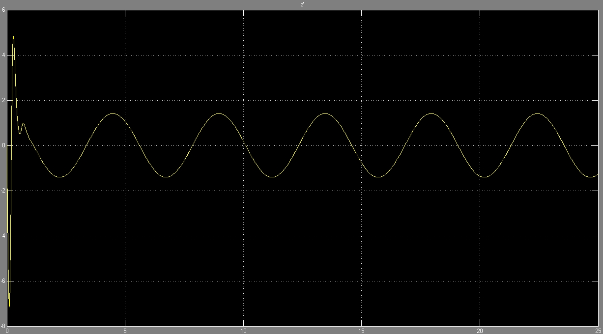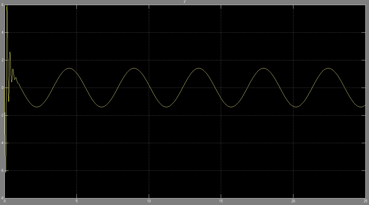 Используя MatLab, получим зависимости ускорения z<sup>''</sup>, скорости z<sup>'</sup> и перемещения z подрессоренной массы КМ от времени. В качестве коэффициента упругости сначала используем постоянное значение, затем подставляем значения, полученные с помощью имитационной модели.